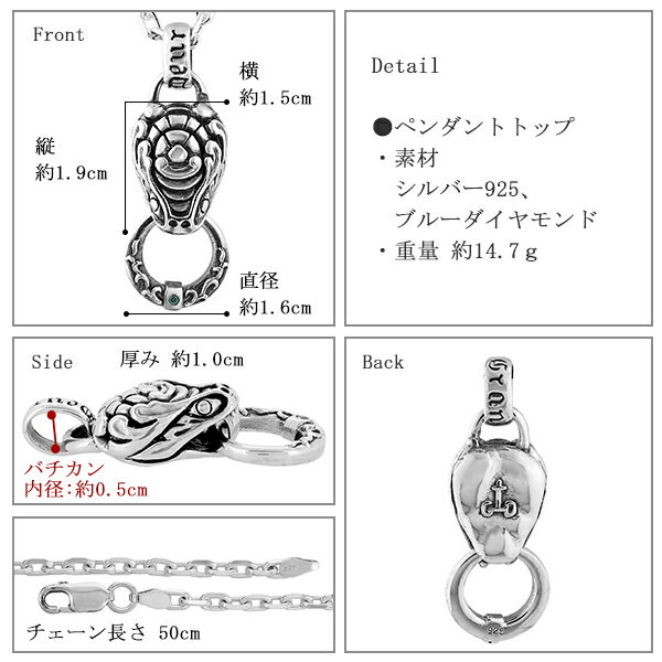 他にはない、一風変わったアクセをお探しの方はぜひ! 商品データ ●ペンダントトップ ・素材 シルバー925、ブルーダイヤモンド ・重量 約14.7g ・スネークヘッド 大きさ(バチカン、金具含まず) 縦幅 約1.9cm 横幅 約1.5 厚み 約1.0cm ・ドアノッカー 大きさ 直径 約1.6cm 厚み 約0.3cm ・バチカンの穴の大きさ 縦幅 約0.7cm 横幅 約0.5cm ●チェーン ・素材 シルバー925 ・長さ 50cm ・幅 約3.2mm(4面カットあずきチェーン) ・金具 ロブスター (シルバーアクセサリー/シルバーアクセ/シルバーペンダント/メンズアクセ/ハード) (こちらの商品はペンダントトップのみもご用意しています) 豊富なデザインと輝くストーンで魅せるシルバー ドメスティックブランド『GRAN DEUR』 ※【買い物カゴに入れる】ボタンの下にある【★